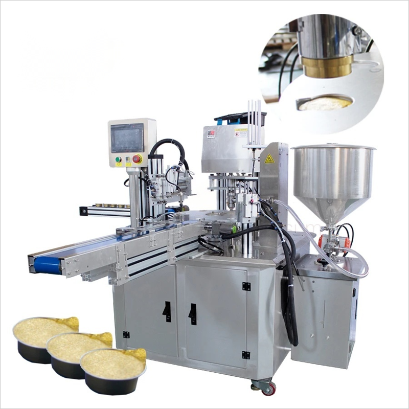 suitable packaging : Pet cup /Plastic Cup /Foil cup or bottlesize :20mm~ 900 mm diameterVolume : 5-1000 gram per cup /bottleFilling material : creamy rice pudding , milk dessert with particles , paste ( high viscosity ), honey, paste, saucefilling hooper : would add with rotating mixer to keep the paste moving in tank .Hooper capacity : 30~100L(according to requirement)extra store tank would offer : cooked material tank 50~ 500 liter other more function please let me know.
