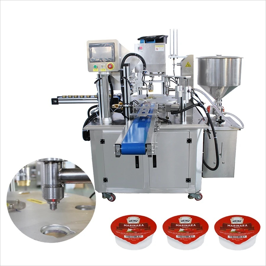 suitable packaging : Pet cup /Plastic Cup /Foil cup or bottlesize :20mm~ 900 mm diameterVolume : 5-1000 gram per cup /bottleFilling material : creamy rice pudding , milk dessert with particles , paste ( high viscosity ), honey, paste, saucefilling hooper : would add with rotating mixer to keep the paste moving in tank .Hooper capacity : 30~100L(according to requirement)extra store tank would offer : cooked material tank 50~ 500 liter other more function please let me know.